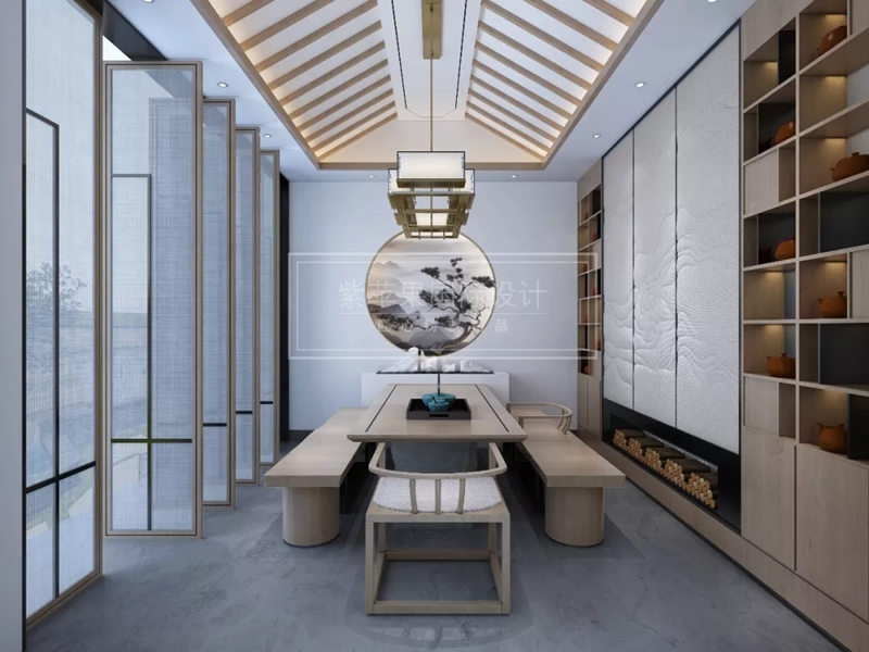 茶室的布置順延墻壁,寬敞的茶桌連接著水墨畫背景的卡座,半墻的壁的展示架等,無(wú)論是坐在卡座上品茶還是站起來(lái)望著窗外的風(fēng)景微風(fēng)輕輕拂過(guò),如此自然舒暢。