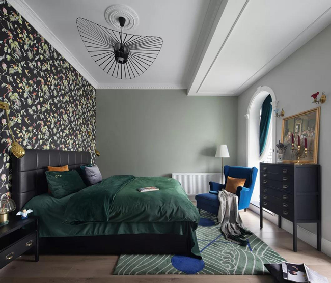 來自雨林的壁紙,黑色是土壤,綠色是生命,剩下來的都是生活;坐在床頭,透過拱門與絨簾,可以感受來自浴室的春風(fēng)沐雨。