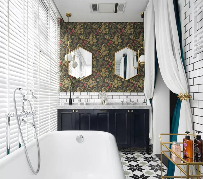 中古的燈具,復(fù)古的浴缸,還有陽光穿過百葉窗留在泡泡上的斑駁身影;來自雨林的的壁紙,生機(jī)勃勃,一種是來自對生活的熱情,一種是對美的篤定。
