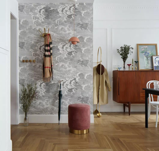 入戶玄關(guān)處中性色壁紙加上暖色調(diào)的換鞋凳和小吊燈,讓整個空間的溫度有了前奏。