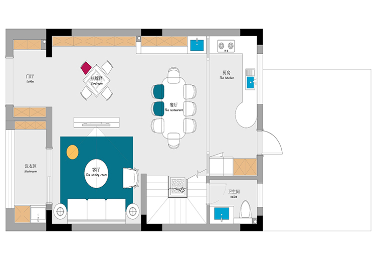 熙華府負(fù)一層除去非承重墻,把整個地下室變成一個超大整體空間。南邊做了一個會客區(qū)域,采光井處連通會客區(qū)后方做了一個健身區(qū)域,沙發(fā)后方設(shè)置水吧臺,滿足會客和健身的飲水需求。北面設(shè)計了品茶區(qū),沿墻設(shè)置收納柜。北面采光井設(shè)計了景觀和休閑椅,可以閱讀、飲茶。