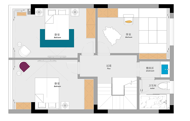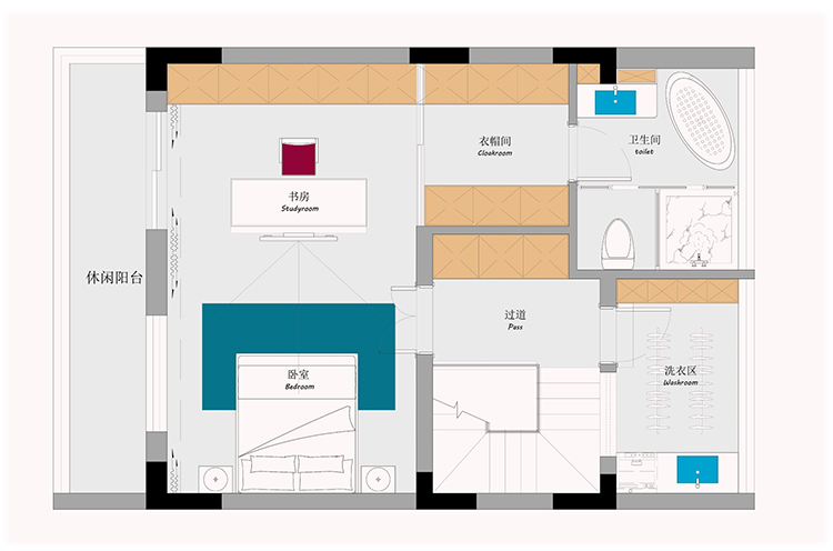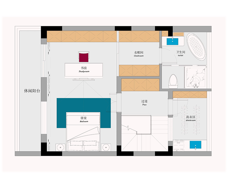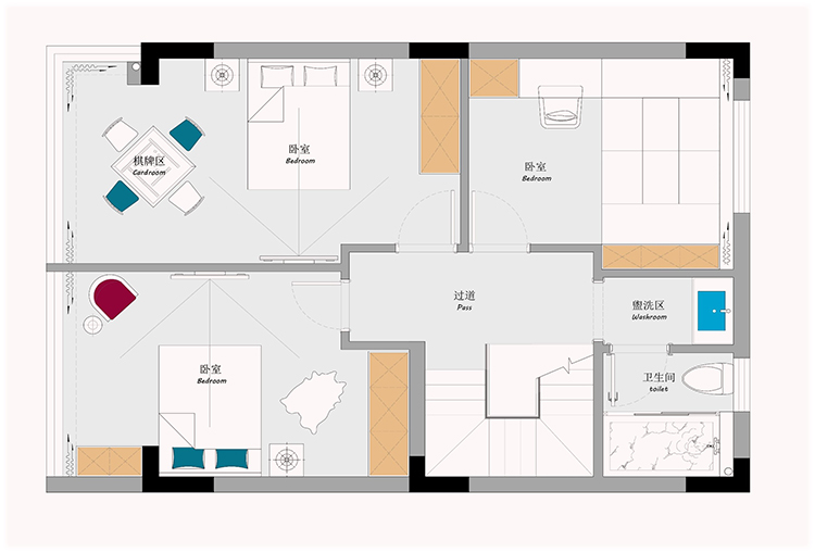 熙華府二層通過敲砌墻重新規(guī)劃,熙華府主臥設(shè)計成了一個大套房。按照客戶對臥室數(shù)量的需求,南面房間既可以作為書房來布置,也可以布置成次臥來使用,可以滿足業(yè)主4房的需求。如果作為書房使用,則北面房間與衛(wèi)生間打通,做一個有內(nèi)衛(wèi)的小套房。如果南面房間作為臥室使用,則保留原有公衛(wèi),北面房間作為一個兒童房來使用。