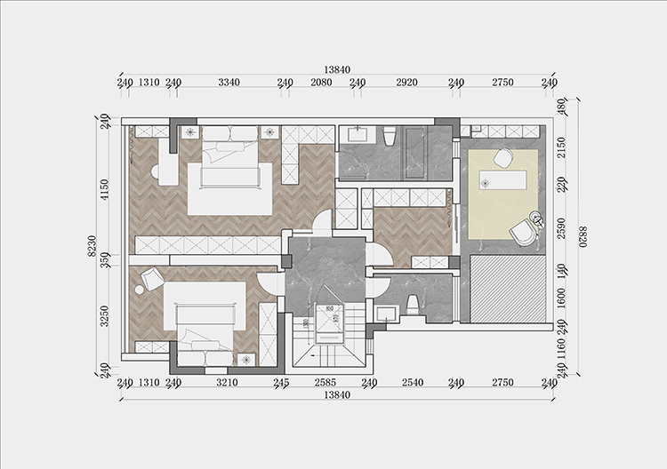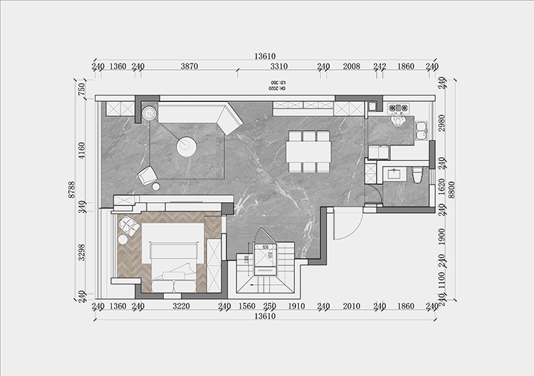 一樓后期方案里的樓梯也很有意思,把一部分空間給到了衛(wèi)生間,這樣會大一點,設置了一個老人房。