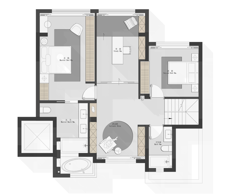 二樓我們?cè)O(shè)計(jì)了兩個(gè)臥室,東南面是一個(gè)主人的大套房,雙臺(tái)盆衛(wèi)浴都齊全,還有設(shè)計(jì)一個(gè)大浴缸,外面的區(qū)域大多做了休閑娛樂(lè),應(yīng)主人的要求安排了書房,南面另一個(gè)次臥可以做客房或者兒童房。