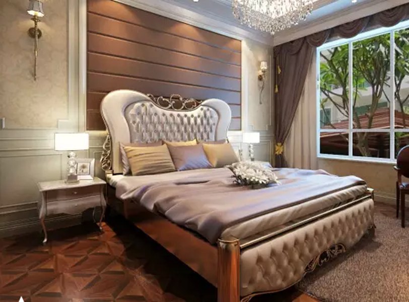象牙白是溫和的顏色,它的浪漫和柔軟讓它與任何顏色的搭配與融合,都能創(chuàng)造出另一種全新的視覺(jué)感受,同時(shí)也絲毫不會(huì)弱化白色的效果。在這間臥房?jī)?nèi),象牙白的運(yùn)用成為打造寧?kù)o睡眠環(huán)境的最好選擇。墻壁與床頭在花式上的統(tǒng)一則將床體空間的睡眠氛圍無(wú)限延伸,整體素雅干凈簡(jiǎn)單的視覺(jué)效果因?yàn)榻瘘S色的加入而融入了一些奢華感。