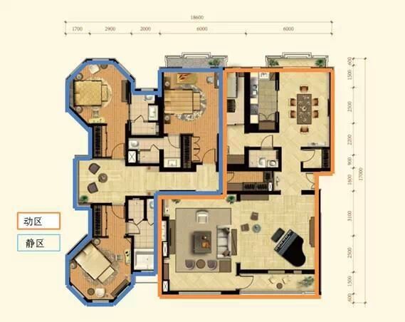 動靜分區(qū):動區(qū)是人們活動較為頻繁的區(qū)域,應(yīng)該靠近入戶門設(shè)置,尤其是廚房;包括客廳、餐廳、廚房、衛(wèi)生間為動:而靜區(qū)主要供居住者休息,相對比較安靜,應(yīng)當盡量布置在戶型內(nèi)側(cè),包括臥室、書房為靜。兩者分離,一方面使會客、娛樂或者進行家務(wù)的人能夠放心活動,另一方面也不會過多打擾休息、學(xué)習(xí)的人,減少相互之間的干擾。范例如下: