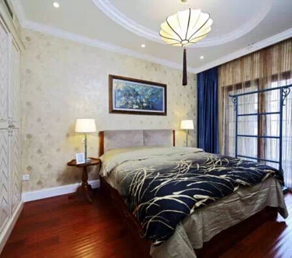 這間臥室的軟裝設(shè)計非常有質(zhì)感,主要是用大面積的紫色天鵝絨來展現(xiàn)的。值得一提的是,房間吊頂?shù)募t紗有了幾分中國古代宮廷的氣質(zhì)。整體的軟裝設(shè)計效果色彩都比較重,這就需要床品的白底碎花來協(xié)調(diào)。