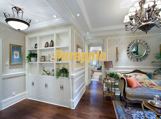 一、玄關(guān)地坪的裝修設(shè)計(jì)——人們大都喜歡把玄關(guān)的地坪和客廳區(qū)分開(kāi)來(lái),自成一體?;蛴眉y理美妙、光可鑒人的磨光大理石拼花,或用圖案各異、鏡面拋光的地磚拼花勾勒而成。在此,我們需把握三大原則:易保潔、耐用、美觀。