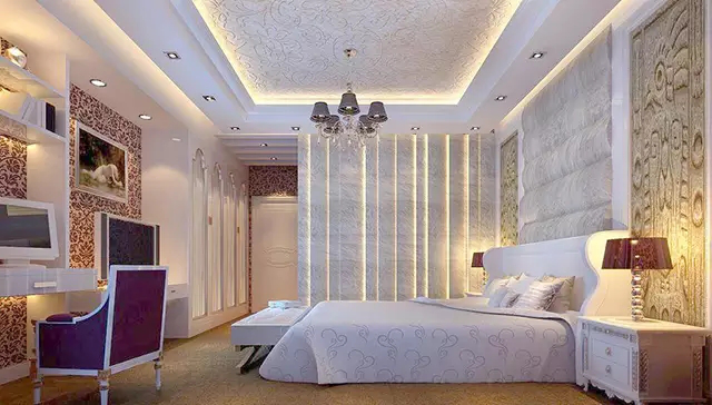 臥室的功能主要是睡眠休息,屬私人空間,不向客人開放,所以臥室裝修不必有過多的造型,通常也不需吊頂,墻壁的處理越簡(jiǎn)潔越好,通常刷乳膠漆即可,床頭上的墻壁可適當(dāng)做點(diǎn)造型和點(diǎn)綴。臥室的壁飾不宜過多,還應(yīng)與墻壁材料和家具搭配得當(dāng)。無錫別墅裝修中臥室的風(fēng)格與情調(diào)主要不是由墻、地、頂?shù)扔惭b修來決定的,而是由窗簾、床罩、衣櫥等軟裝飾決定的,它們面積很大,它們的圖案、色彩往往主宰了臥室的格調(diào),成為臥室的主旋律。