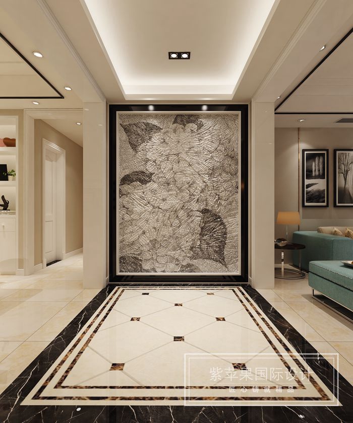 整個空間簡潔貫通,以米白色為底色,配以湖藍色的沙發(fā)及明黃色的臺燈打破單調(diào),又在餐廳與客廳間的玄關(guān)處貼以馬賽克背景墻作為兩個功能處的銜接,豐富了空間的層次感。使空間呈現(xiàn)出活潑、明媚的感覺,新中式的細(xì)節(jié)和簡約風(fēng)格也能碰撞出不一樣的火花。