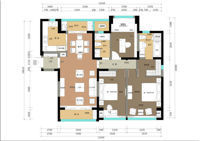 在平面規(guī)劃中,與客餐廳相連的南北陽臺提高了采光性,在生活方面提高舒適度,北陽臺規(guī)劃為生活陽臺和設(shè)備陽臺,由于主臥有很充足的面積,這樣便可以規(guī)劃出獨(dú)立的主臥衣帽間,同時也解決了主衛(wèi)的門正對主臥的床的尷尬問題。