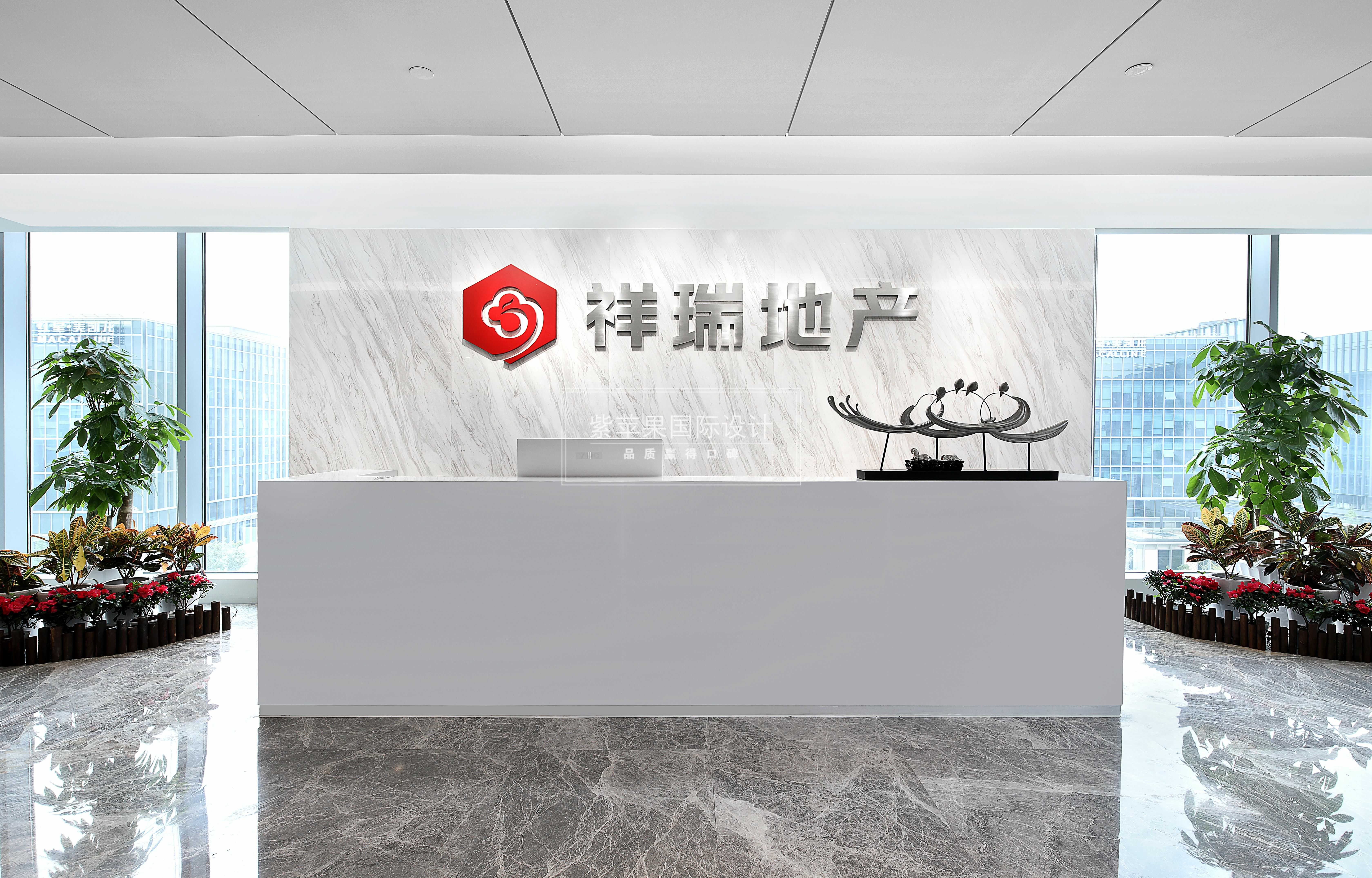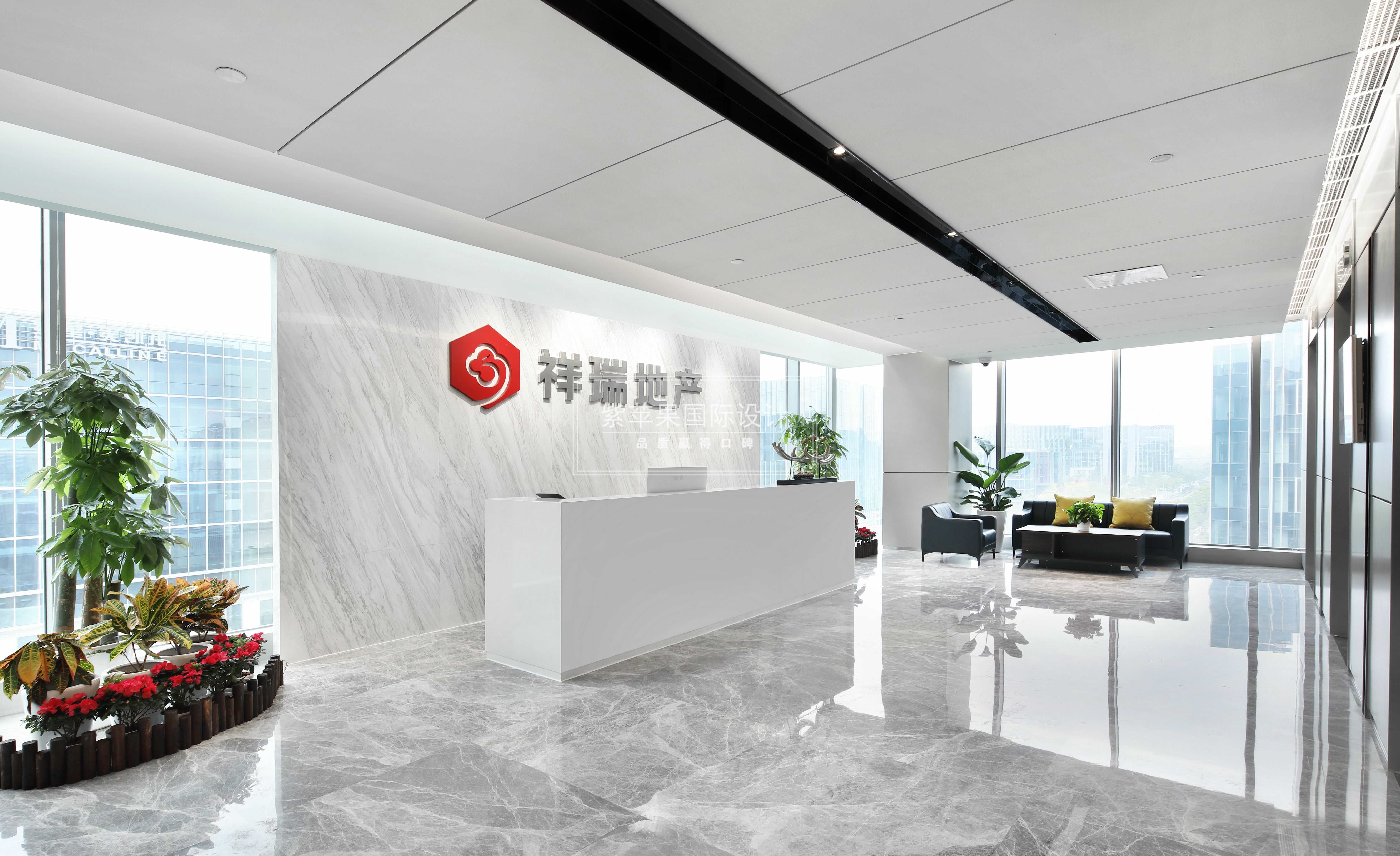 一出電梯間,映入眼簾的就是祥瑞的前臺處。大面積留白的區(qū)域顯得寬敞大氣、不拘小節(jié)。采用經(jīng)典黑白的色彩搭配,兩旁角落處用綠植盆栽作加飾,不失商務(wù)禮儀和氣度。