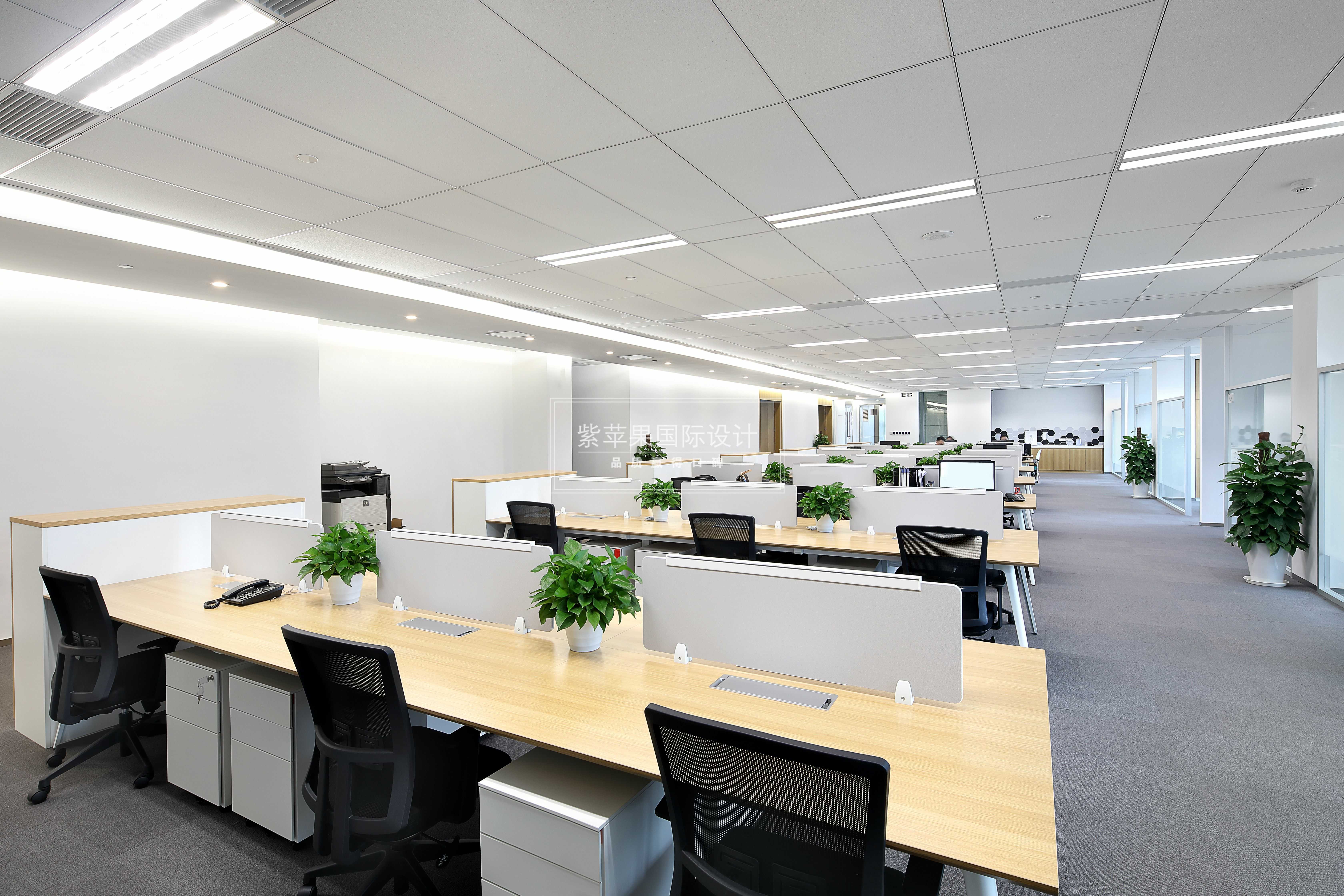 進(jìn)入一層內(nèi)部,最核心的位置作為整體開放式的辦公區(qū),橫向排列的辦公桌看起來整潔有序,原木色表面搭配經(jīng)典白素雅干凈,清新綠為空間增添了健康活力,營造了一種嚴(yán)肅高效、開放活潑的辦公室氛圍。