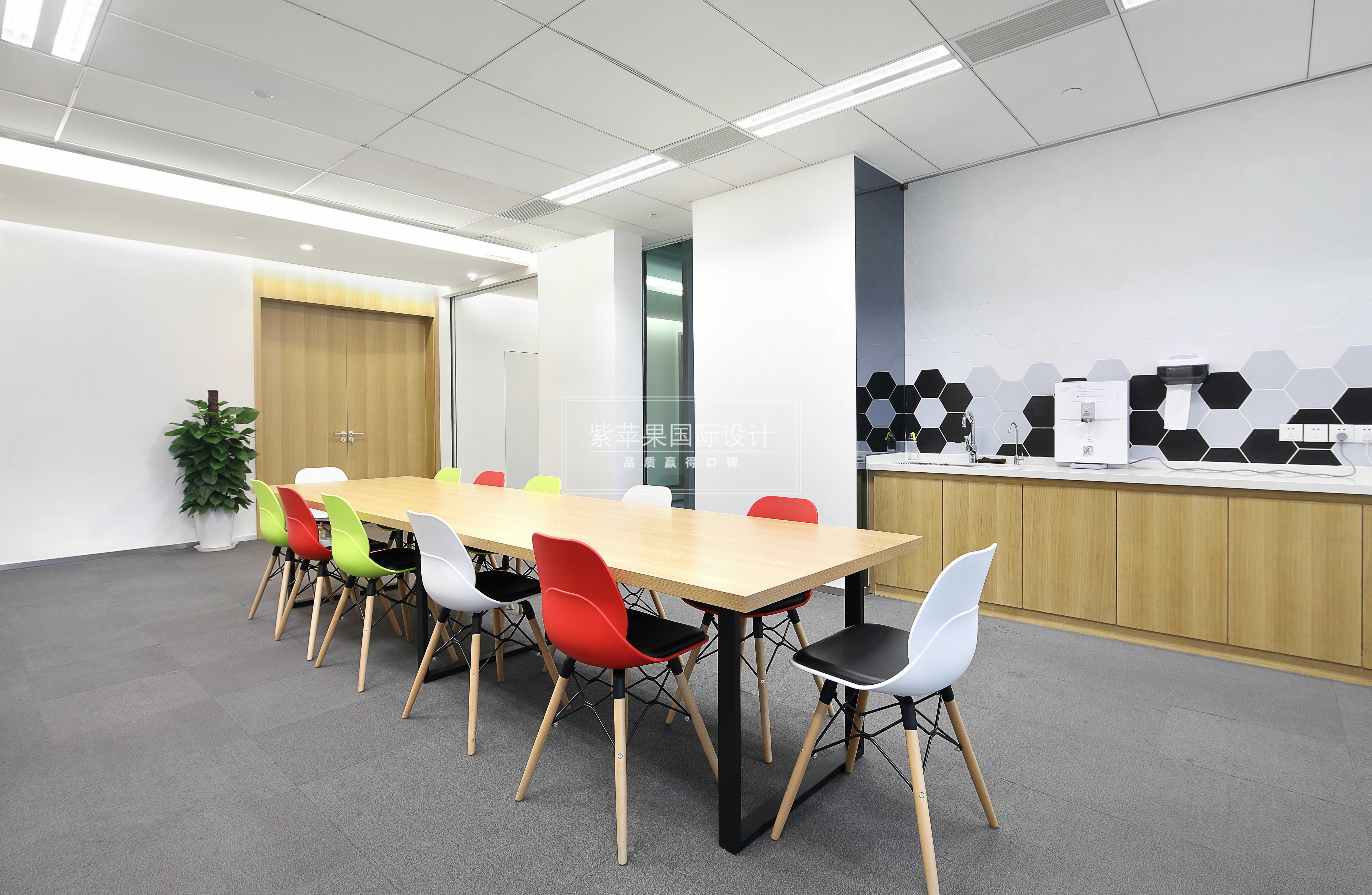 一層茶歇區(qū)設(shè)置在進(jìn)門的拐角處,簡單的木質(zhì)長桌圍繞著一圈彩色的座椅,接水處的墻壁采用了多邊形拼花造型,溫馨色調(diào)打造了簡約明快的休憩場所。